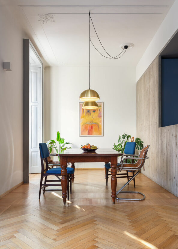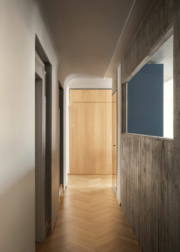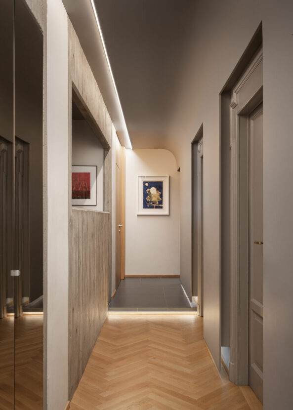 The project is located in the Quadronno neighbourhood, one of the most elegant corners of Milan, where period buildings coexist with works by masters such as Ponti, Mangiarotti and Caccia Dominioni. In this context, Offstage transforms an early twentieth-century residential apartment for a family of four, radically redesigning the internal layout while respecting the existing features.