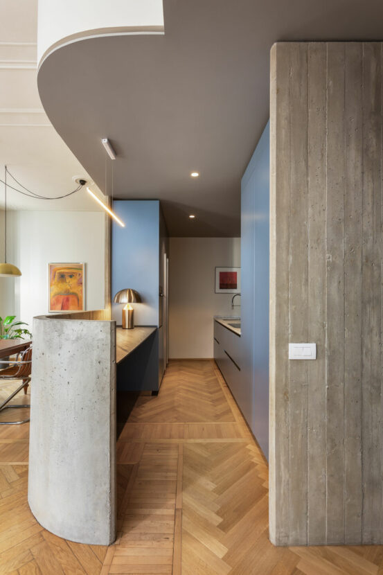 The intervention stems from the need to obtain an additional bedroom and rethink the distribution of spaces. The kitchen, previously located in a separate room, becomes the focal point of the home: it is now placed at the centre of the house, in the living area, as a true “concrete heart”. Built in reinforced concrete with a curved wall and an opening toward the corridor, the kitchen visually expands the spaces and becomes the identity element of the entire project.