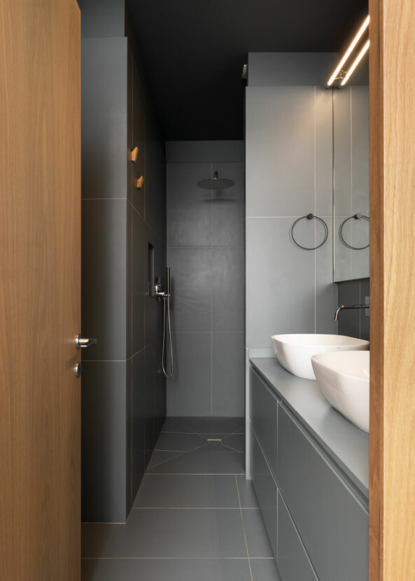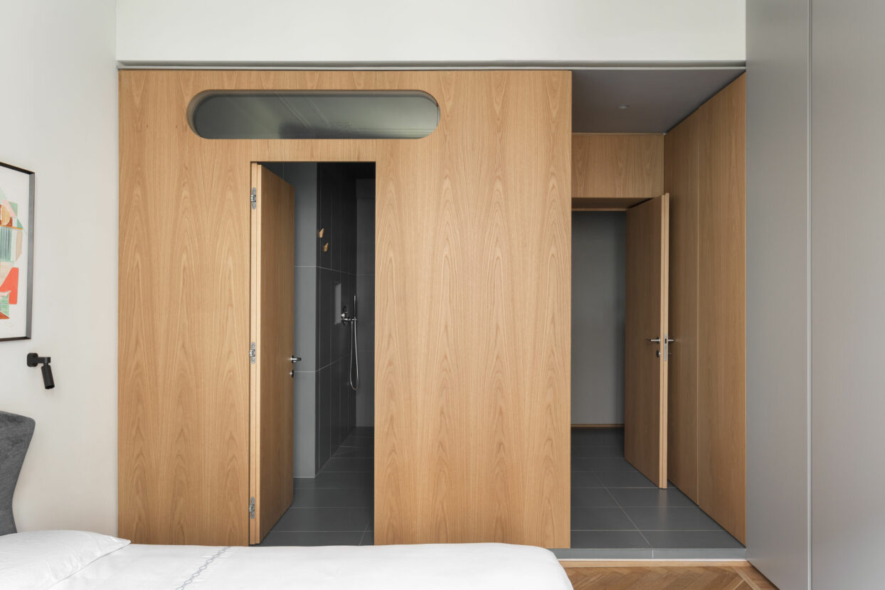 The material language continues with plasterboard ceilings with fluid lines, bespoke oak joinery elements, oak and beech parquet, restored original doors and ceiling decorations. The result is a balance between historical memory and contemporaneity, where natural materials and light play a central role in the perception of space.