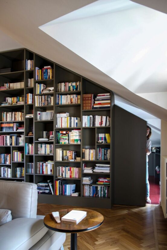 The project was born from the need to enhance a complex volume, characterised by irregular ceiling slopes and an internal staircase leading to the tower on the upper floor. The goal was to transform these peculiarities into strengths through a three-dimensional project that connects planes, heights and vertical views.