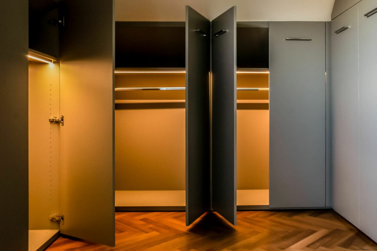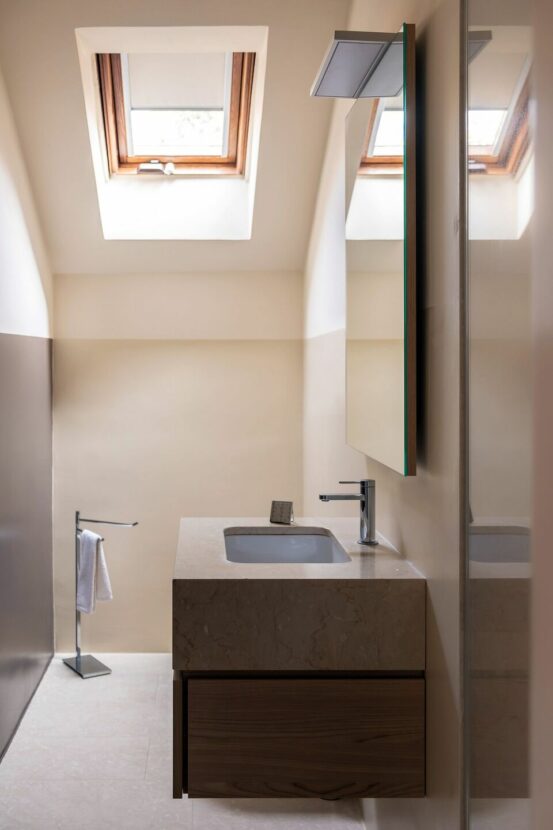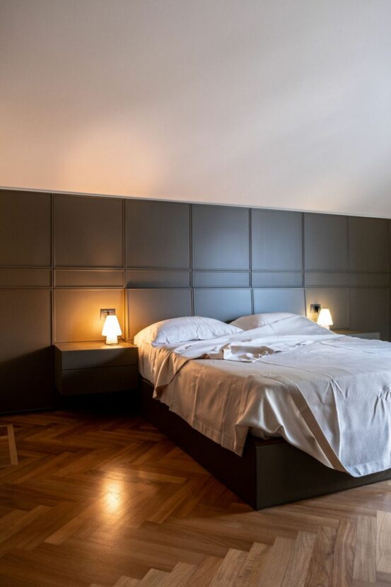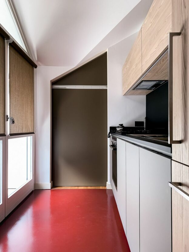 Throughout the apartment, bespoke joinery takes on the role of boiserie, concealing functions and storage to maintain formal fluidity and cleanliness. Materials and details define the identity of each space: the restored original parquet, Botticino stone used in the bathrooms and custom furniture, wooden window frames designed to measure, and cotton and linen curtains. A refined palette that strikes a balance between contemporary elements and the memory of what came before.