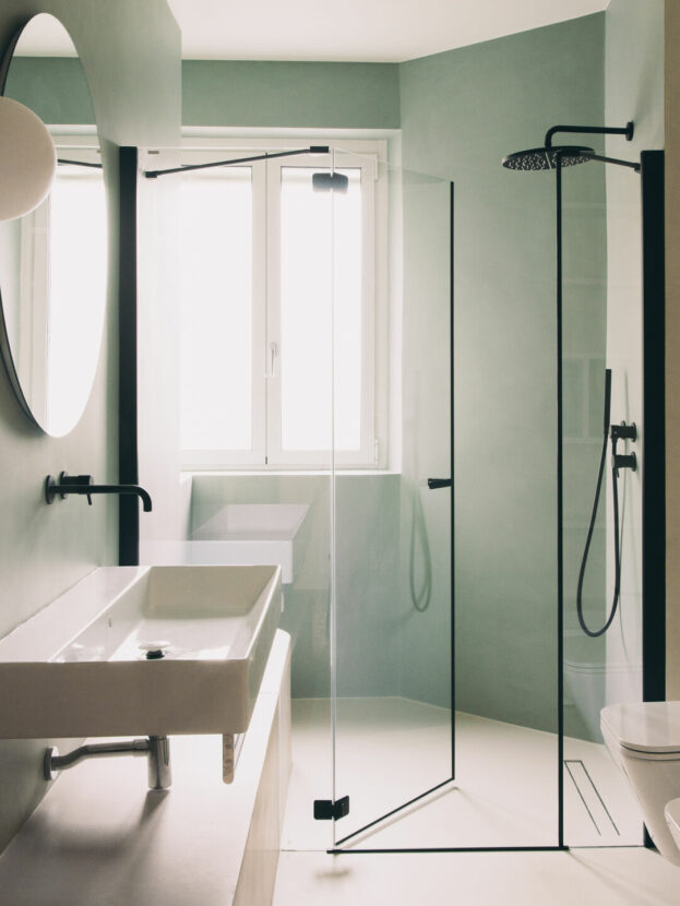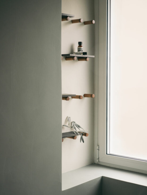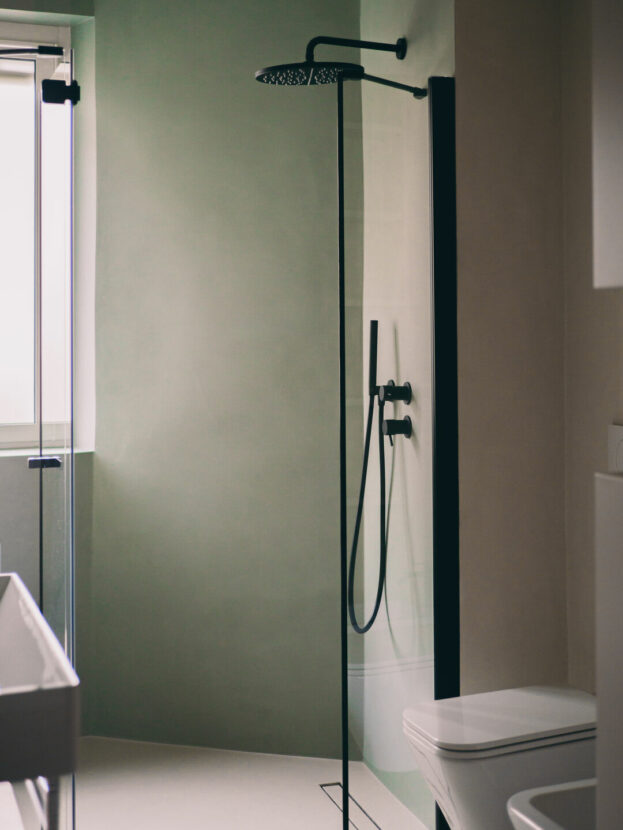 The shower is the central element of the project, conceived as a compositional focal point. Natural light filters through a custom-made perforated panel, generating visual effects that amplify the perception of depth. Inside and outside the shower, a monolithic material bench creates functional and visual continuity.