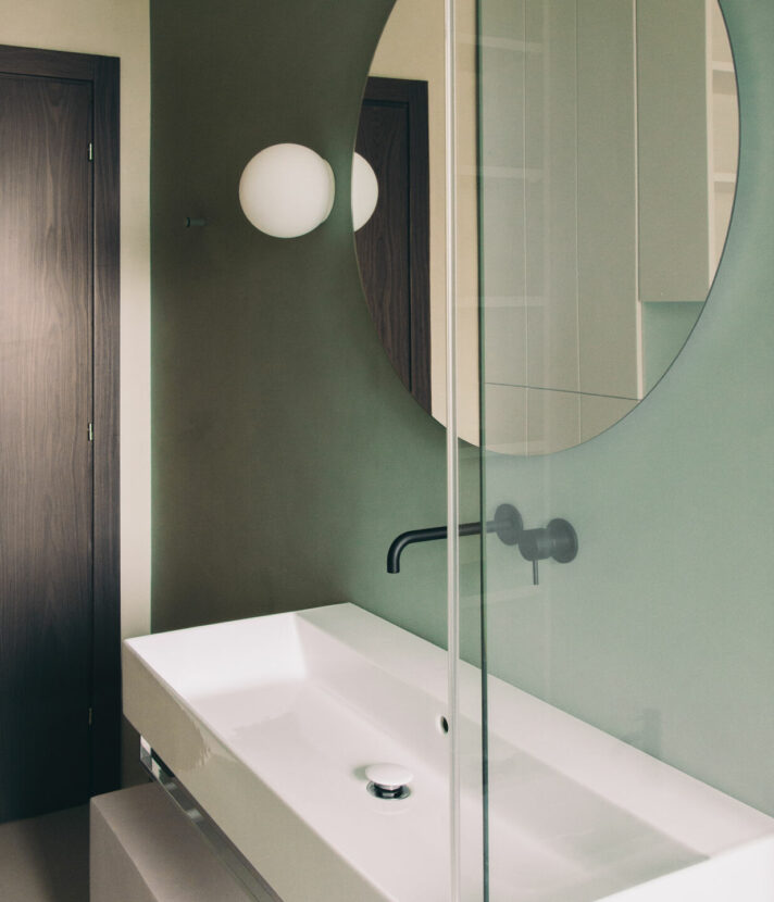 The choice of materials reinforces the sculptural character of the space: resin surfaces, continuous volumes and calibrated tones build an intimate yet decisive environment, where every detail responds to both practical and aesthetic needs.