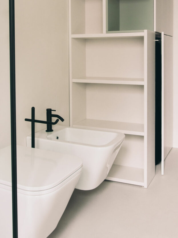 The result is a bathroom that transcends its function and becomes a small wellness space, defined by essentiality, materiality and light.