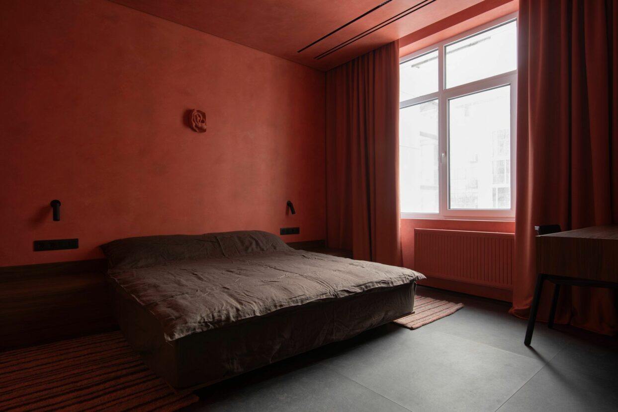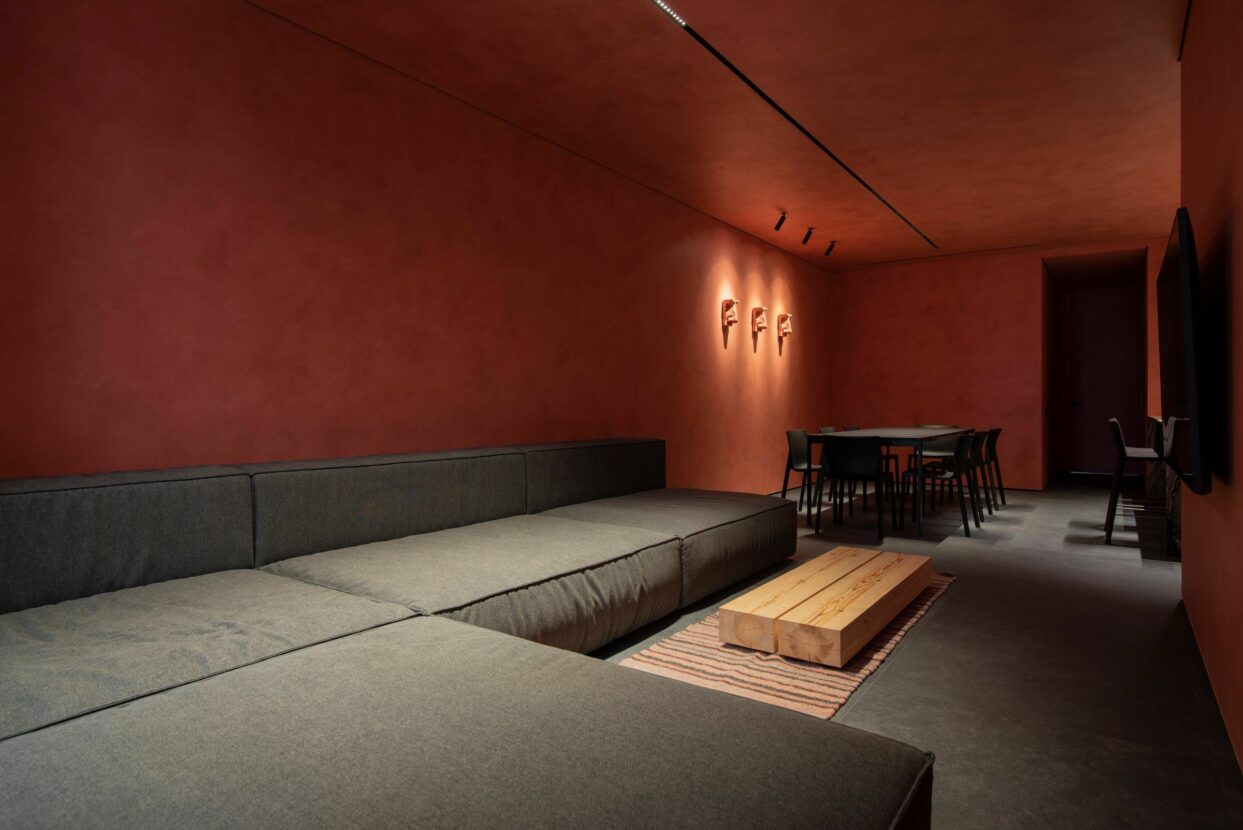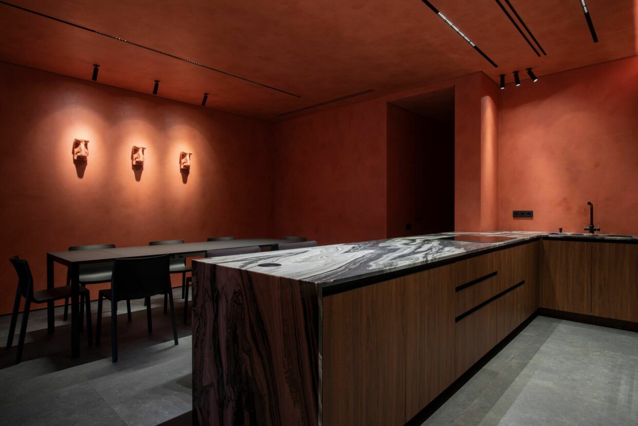 The centrepiece of the apartment is the decorative plaster applied to walls and ceiling, a finish that imitates paint worn by time. Applied by hand, it generates a soft, organic texture inspired by Mediterranean and Tuscan architecture. This continuous surface envelops the spaces, dissolves the boundaries between functions and transforms the interior into a single coherent volume.