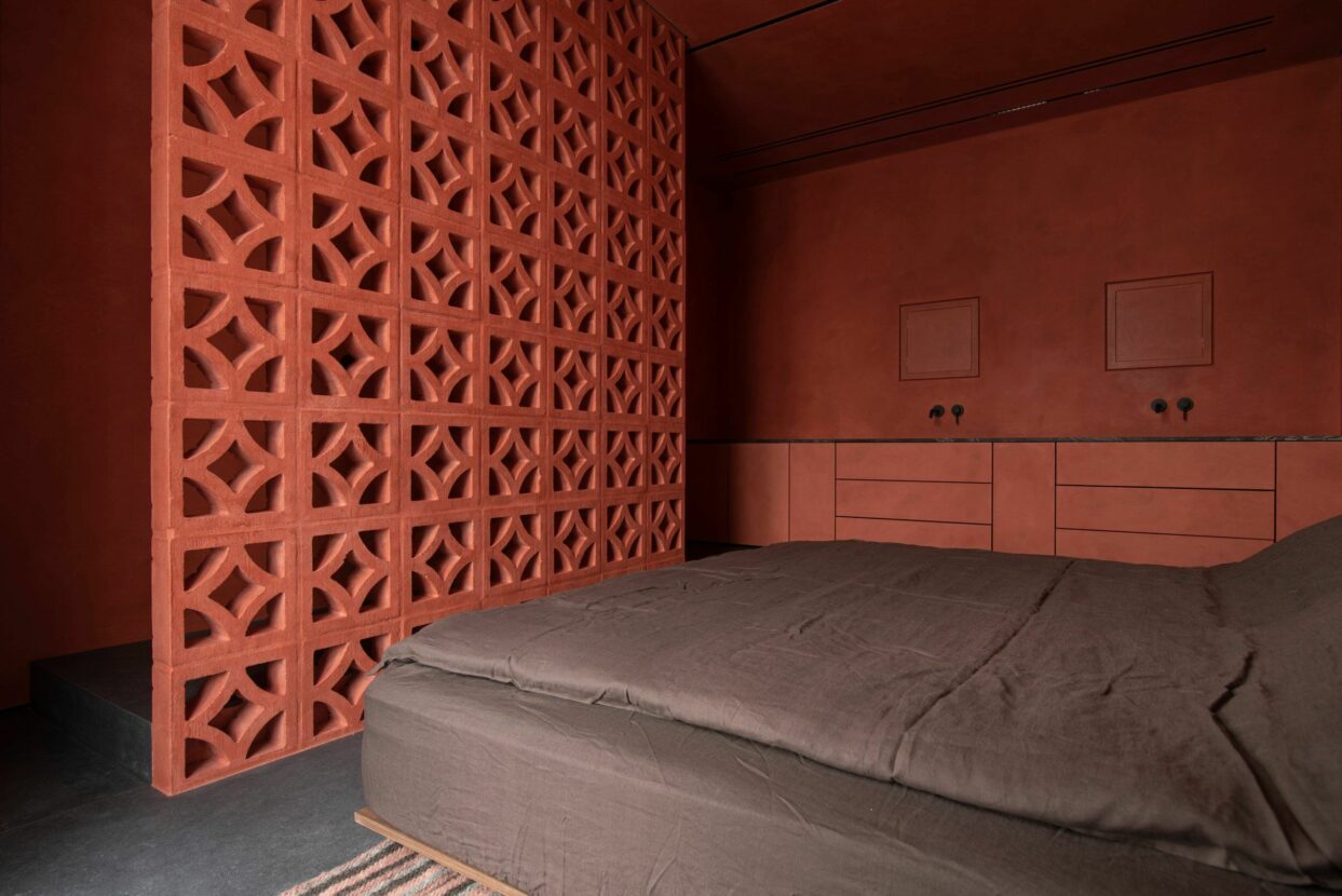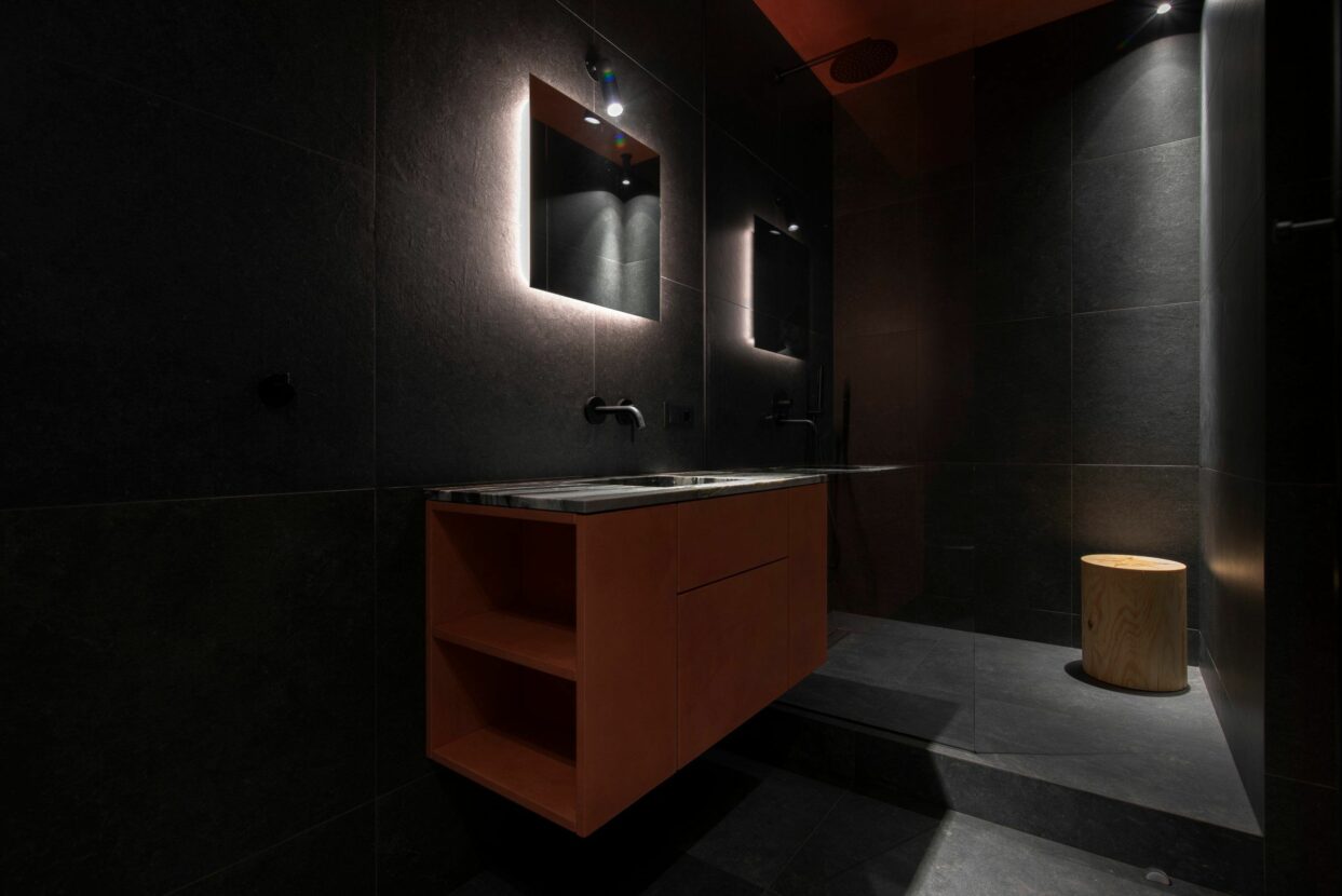 The private bathroom space, separated only by a glass panel, introduces an ironic and theatrical note into the project. A radical, intimate and sensory interior, true to the essential poetics of the studio.