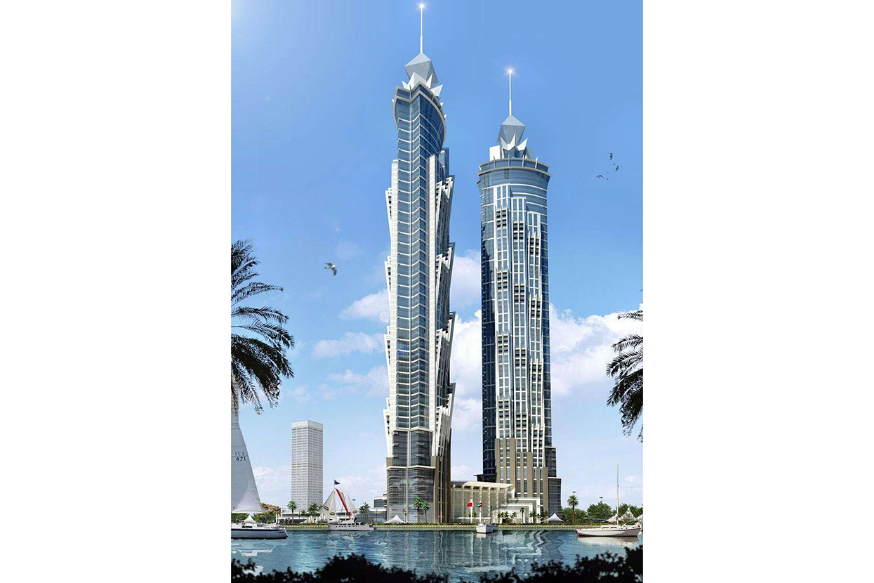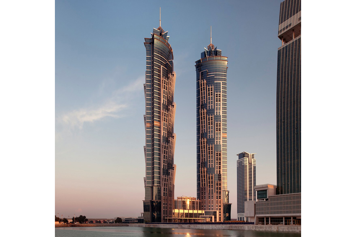 The shape is inspired by the date palm tree. The towers are arranged symmetrically on the 7-storey podium to provide views of the Burj Khalifa, the Business Bay and the sea.
