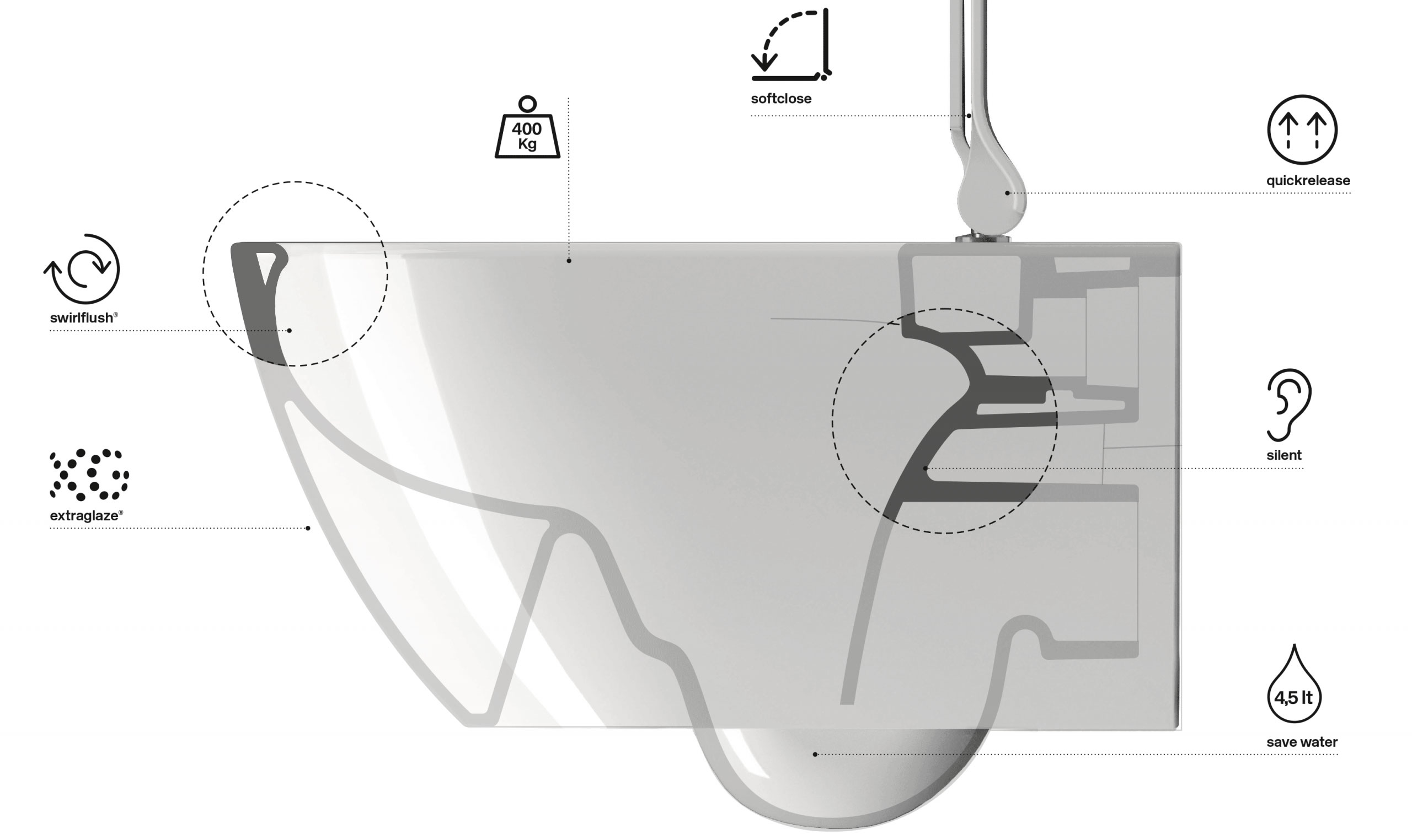 Extremadamente silencioso: El nuevo sistema de enjuague Swirlflush®, con un nivel sonoro de sólo 64db, garantiza un silencio extremo durante la fase de descarga.