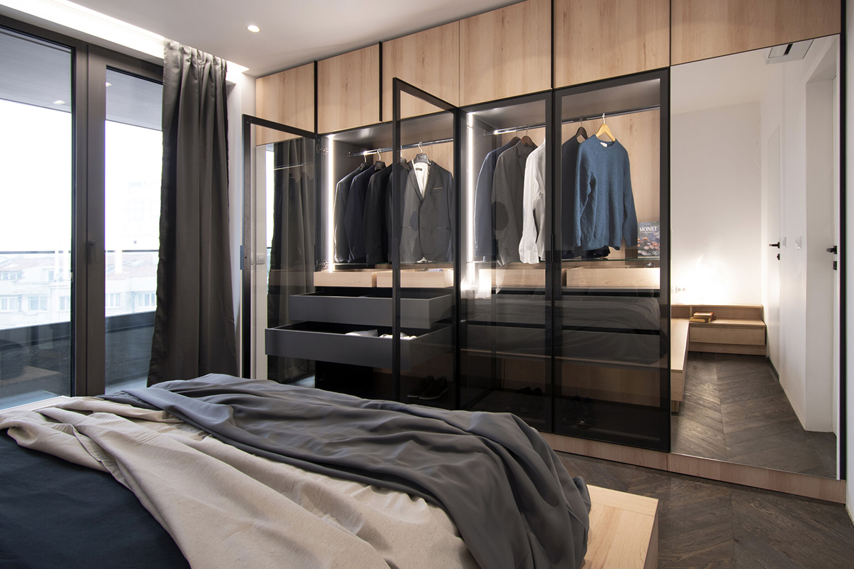 Nella camera da letto principale, il letto e i comodini formano un unico sistema realizzato in betulla, che si estende lungo il perimetro dello spazio. L’armadio, su misura, alterna pannelli in legno, vetri colorati e superfici a specchio, articolandosi in scomparti funzionali con accessori dedicati e vani nascosti.