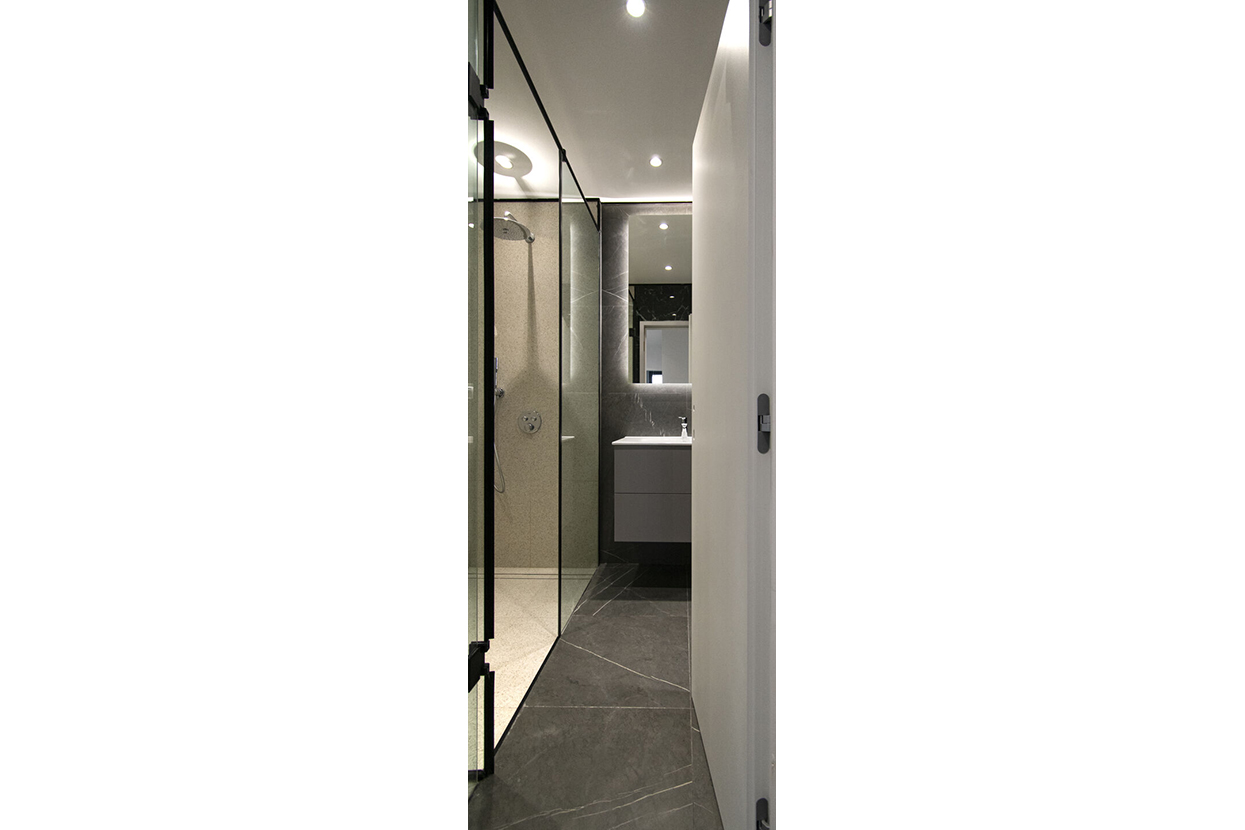 Le grandi vetrate panoramiche e la posizione elevata dell’appartamento consentono una vista ampia sulla città e garantiscono un’illuminazione naturale costante, che valorizza i materiali e i volumi degli interni.