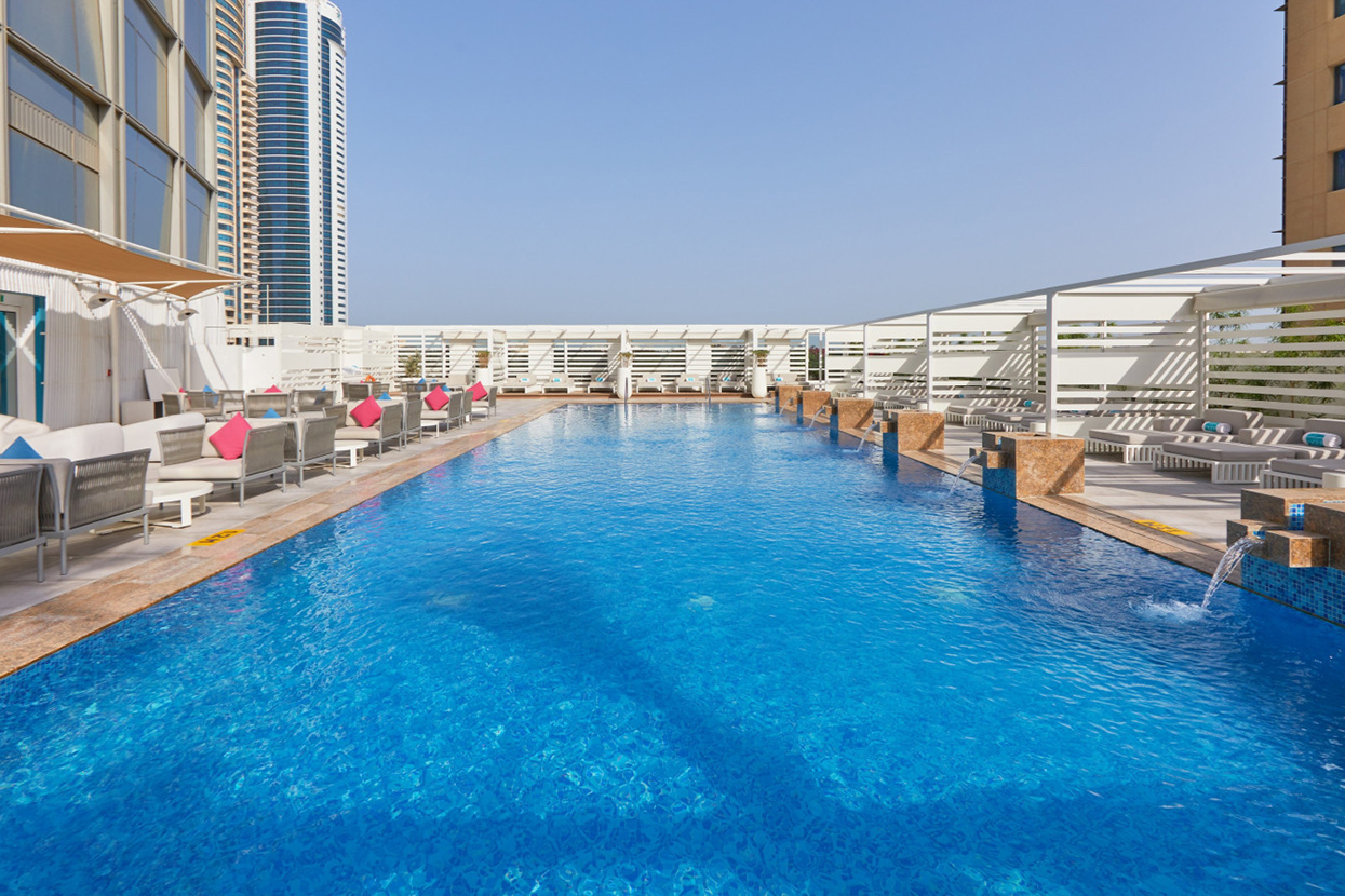 The tower has 3 levels of underground parking and 7 levels of above ground parking, 10 stories of four star hotel rooms, 21 stories of class A office space, one level with restaurants and a fitness club including a roof top garden and pool, and retail and cafés on the ground floor.